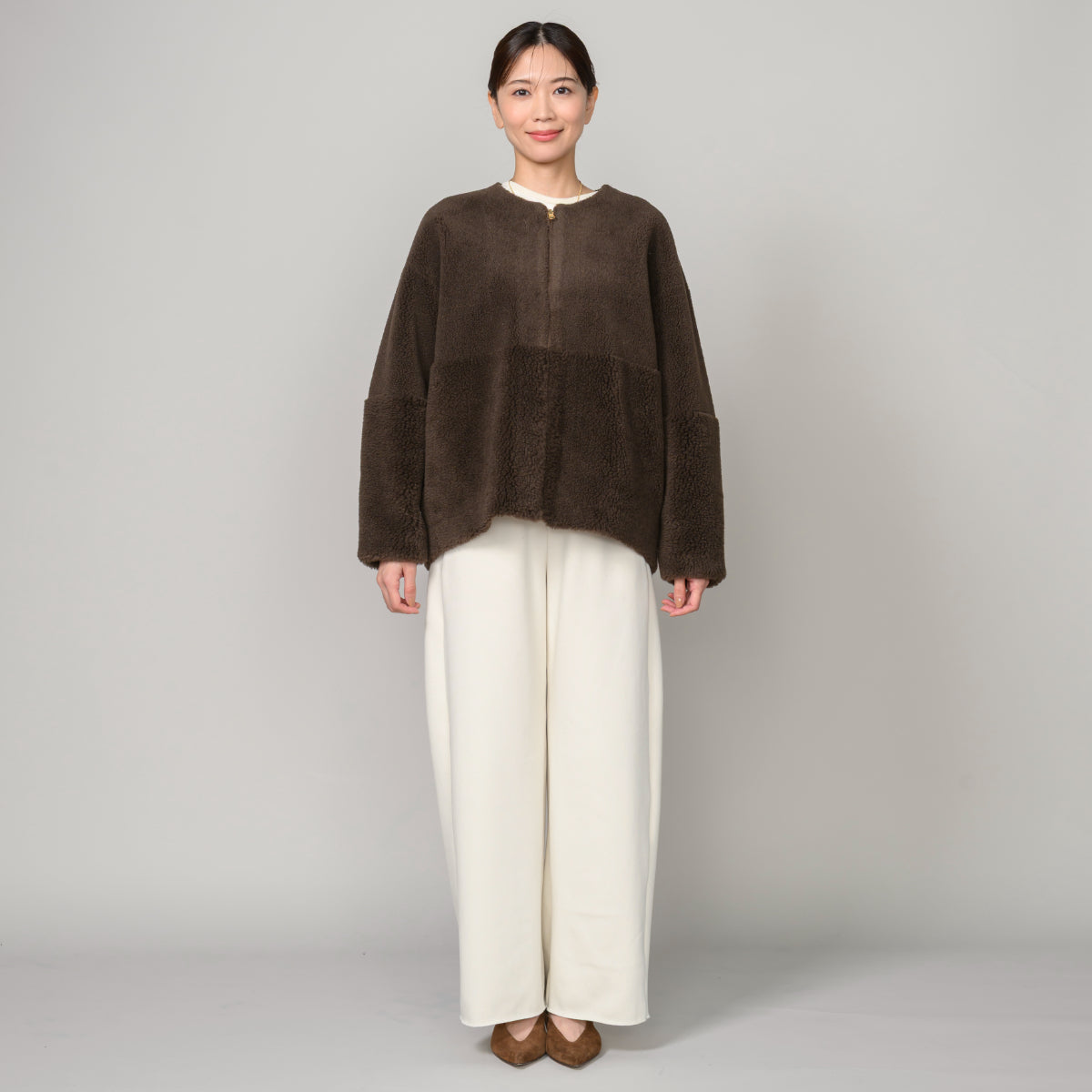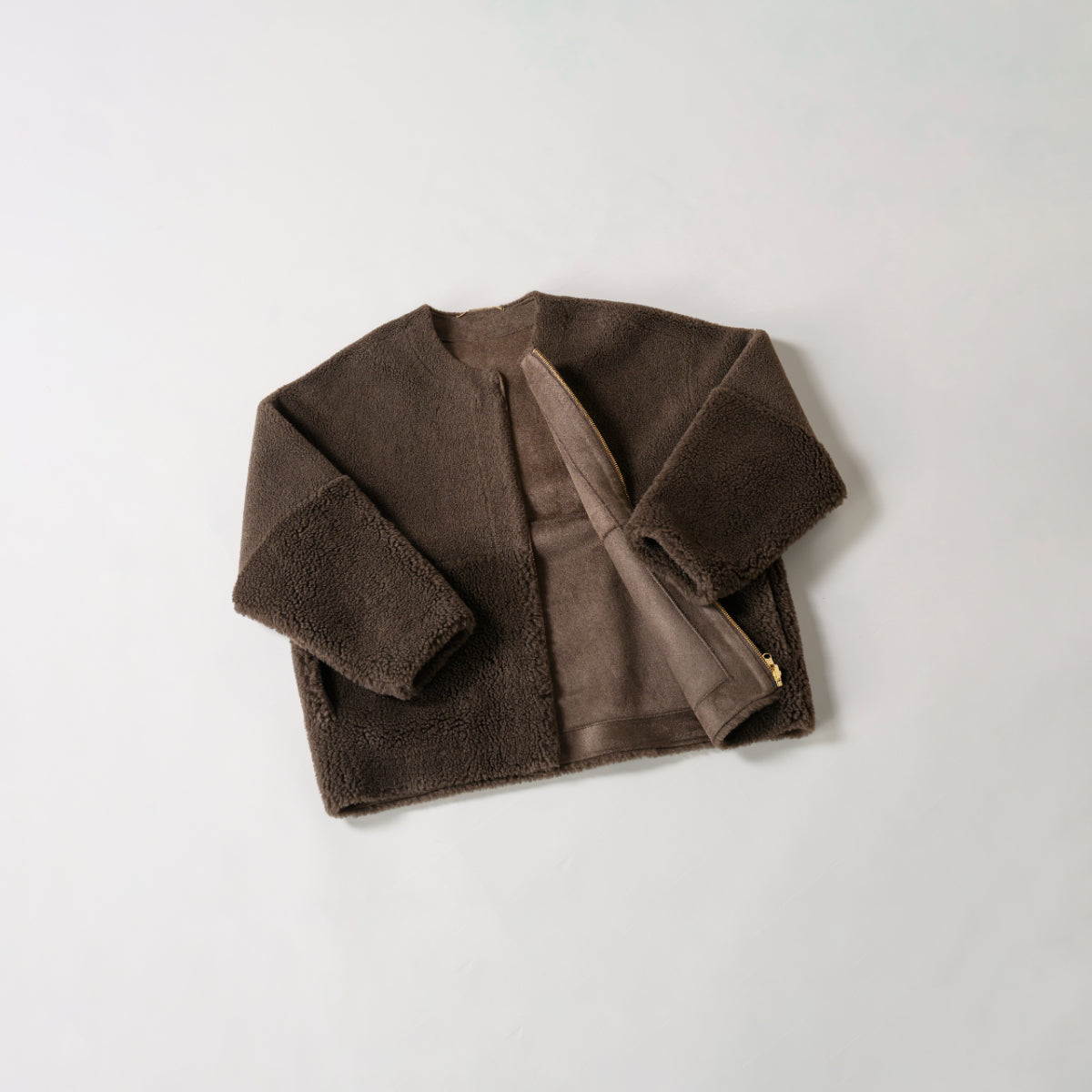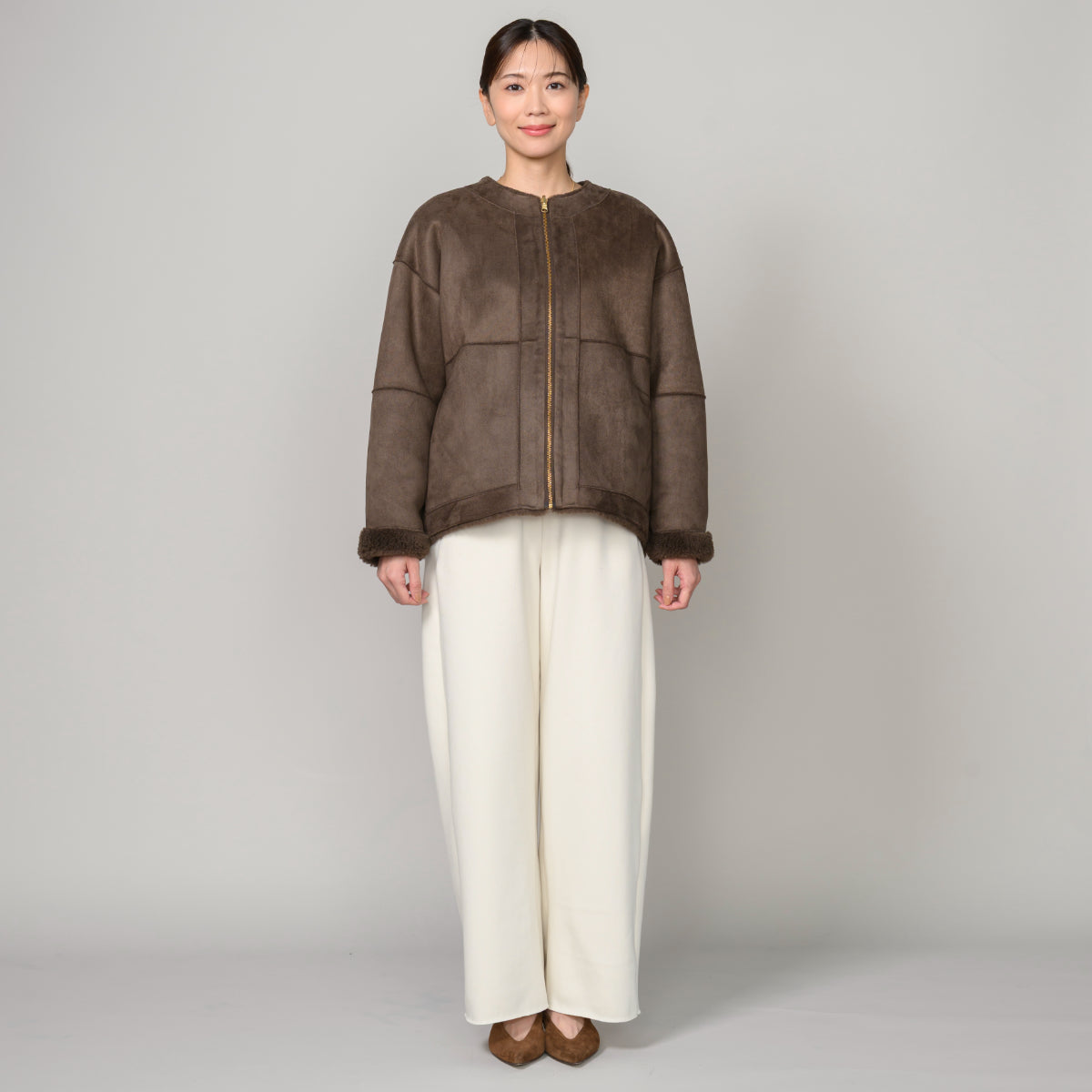 昨年より大好評なフェイクムートン素材を使用したノーカラータイプのジップアップショートコートです。